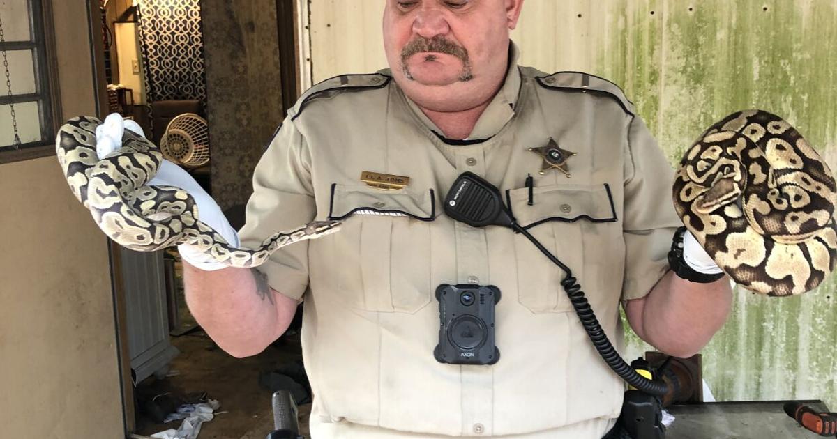 The sheriff’s office once again worked with the Humane Society of Louisiana to seize five dogs and two ball pythons. Two area veterinary clinics – Jonesboro Vet Clinic and PetStar Vet Clinic in Bossier City — also volunteered to help by temporarily housing them and providing care.