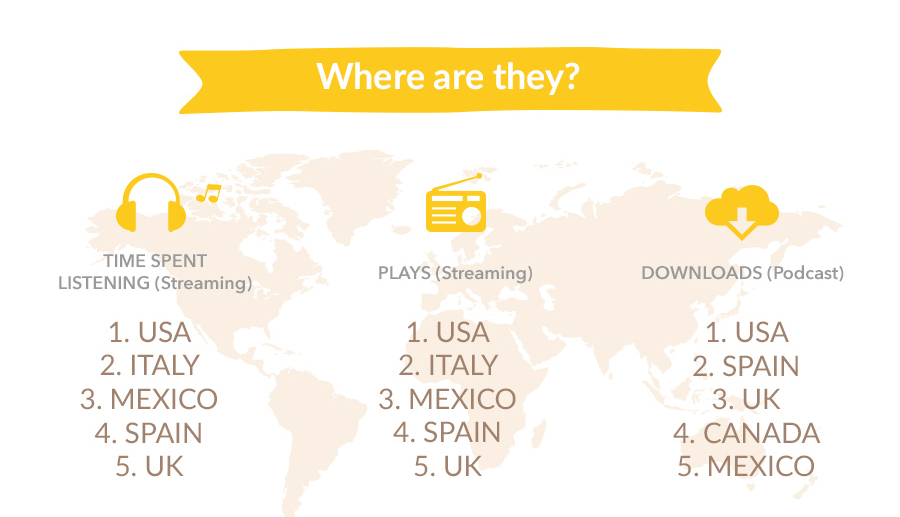 The United States keeps its first place standing in Spreaker’s community, followed by Italy for streaming and then by Spain for number of downloads. We have some new entries on the download side: welcome onboard to Canada and Spain!