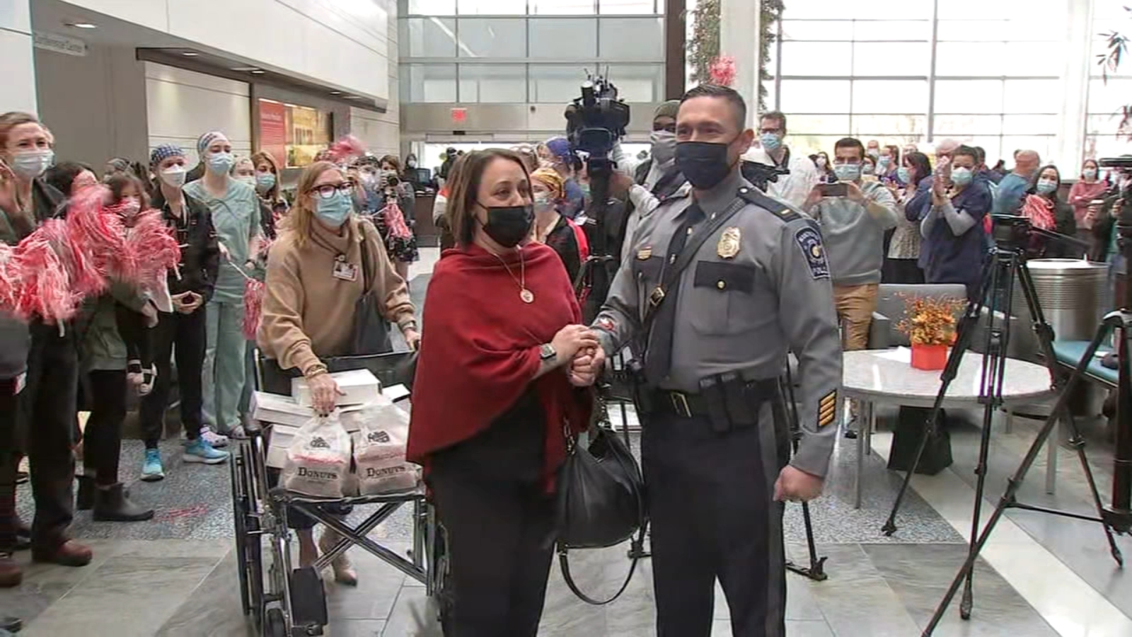 Healthcare workers cheered on Officer Ellis as he arrived at Cooper University Health Care to thank the team who saved him.